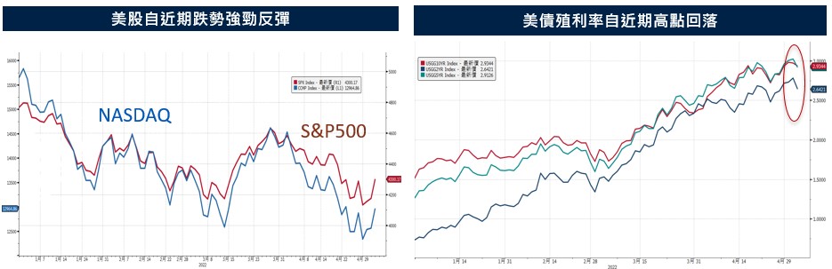Fed宣布升息兩碼至0.75%-1.00%,為2000年以來首見,並將從6月開始執行階段性縮表,在市場預期之內,而主席鮑爾淡化未來一次升息3碼的可能性,緩解對積極升息的恐慌情緒,美股盤中強勁翻紅、美債及美元指數自高檔回落。由近期賣壓沉重的Nasdaq及費半指數領軍強彈3.2%及3.9%,Nasdaq指數收在12964點,S&P500上漲3%收在4300點,道瓊上漲2.8%收在34061點。美債殖利率自先前高點明顯回落,10年債殖利率下滑約4bps收2.93%、短天期的2年債及5年債則回落11-14bps,分別收在2.64%及2.91%。
