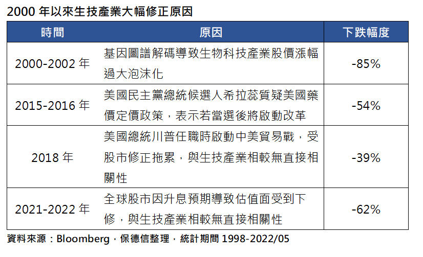 醫療生技產業物美價廉!今年來全球股市受到升息、估值下修、前景悲觀等影響,具有創新性質的醫療生技產業也難逃下跌命運,不過根據歷史數據來看,2021至2022年生技類股修正幅度已來到近20年最大,顯示未來下檔空間有限,若能搭配具有防禦性質的醫療類股,更能增添未來掌握市場彈升的契機。(資料來源:Bloomberg,2022/05)