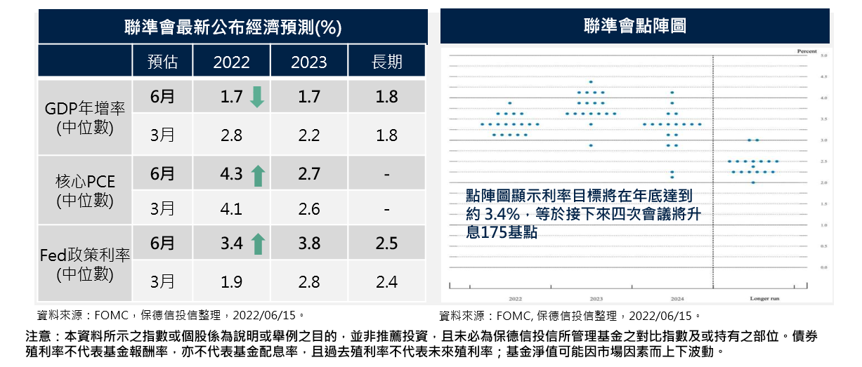 聯準會預估今年GDP成長率,自3月預期的2.8%調降至1.7%,同時失業率預估值也自3月預期的 3.5%調升至3.7%。顯見在供給面的難題下,聯準會透過升息來「控管需求端」方式來抑制通膨。