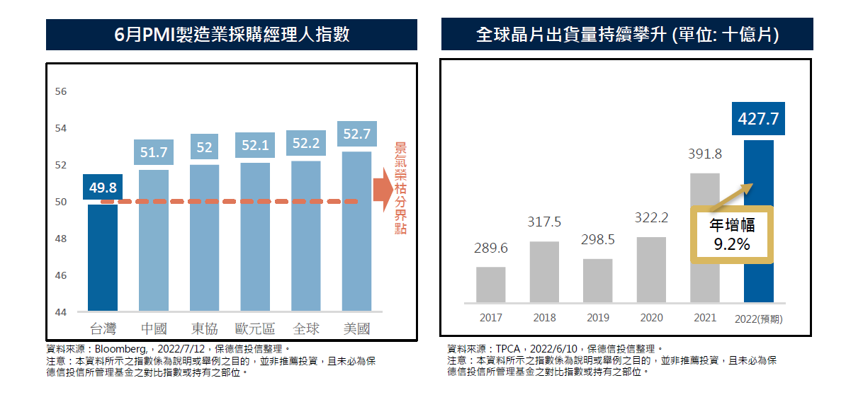 儘管市場緊張情緒隨全球通膨熱浪迫使各國央行加快貨幣緊縮步伐而持續高漲,台灣PMI製造業採購經理人指數亦微幅滑落至景氣榮枯線之下,但隨中國動能呈現回溫,加上各國製造業仍呈現擴張,預期在各國需求張力擴大之下,可為迅速推升台灣製造業動能重返擴張。
