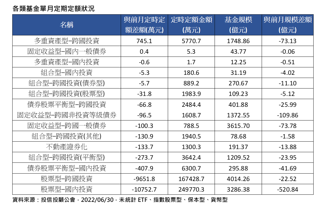 近期全球資產走勢動盪,投資情緒也跟著受到影響,根據投信投顧公會最新資料統計,在各類型基金中,排除貨幣型基金,僅有跨國多重資產與國內固定收益唯二兩大基金,6月定期定額金額不減反增,其中,跨國多重資產基金單月定期定額金額增加745.1萬元最多,其他類別基金同期定期定額金額全數縮水,顯見在市場動盪時,股票、債券、REITs等各類資產皆能布局的多重資產基金,因為具有跟漲抗跌之效,成為亂世中資金聚焦之處。(資料來源:投信投顧公會,2022/06/30)