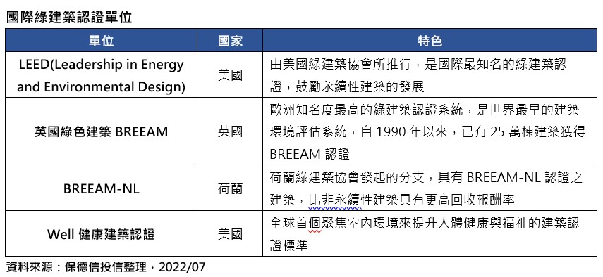 不僅住宅講求節能,國際商辦等也相繼透過節能、降低能源成本等來達到綠建築標準,根據統計,建築占全球能源消耗量高達近三成之多,光是歐洲的溫室氣體排放,高達36%來自建築,因此歐洲已訂定在2030年前,所有新建築必須達到零碳排標準,而歐洲公共房地產協會(EPRA)所制定綠色聚焦定義,則規定可投資之租賃房產REITs,需同時符合綠色建築認證以及衡量能源使用效率的雙重標準。(資料來源:保德信投信整理,2022/06)