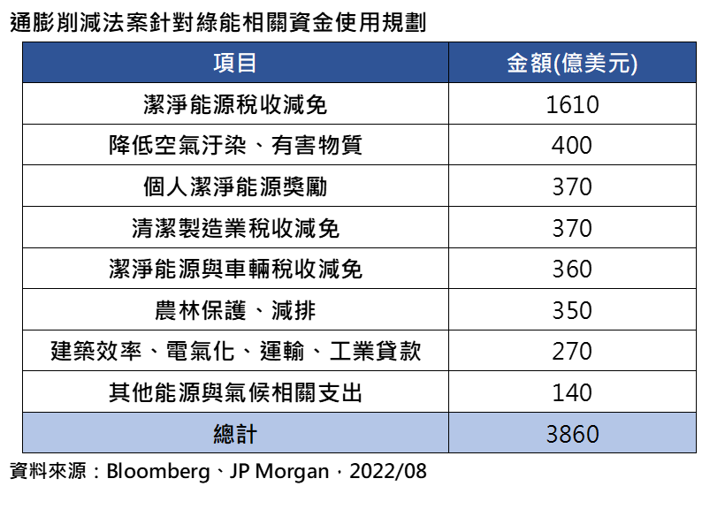 PGIM保德信全球生態友善ESG多重資產基金經理人張書廷指出,該法案在潔淨能源方面挹注近3900億美元資金作補貼、減稅,並推動相關產業,包括提供電動車購車稅務優惠、發展再生能源科技、扶植太陽能板、風力渦輪、電力車、關鍵礦物處理、電池等綠能科技的在地生產,培植美國本土供應鏈、透過抵稅獎勵產業引進碳捕捉、氫能等新興氣候科技、扶持綠能計畫「綠色銀行」、農業減排等,所帶動的商機不容小覷,且環境保護已成為全球各國共識,由美國登高一呼,有助於各國加速產業向ESG目標靠攏。(資料來源:Bloomberg,2022/08)