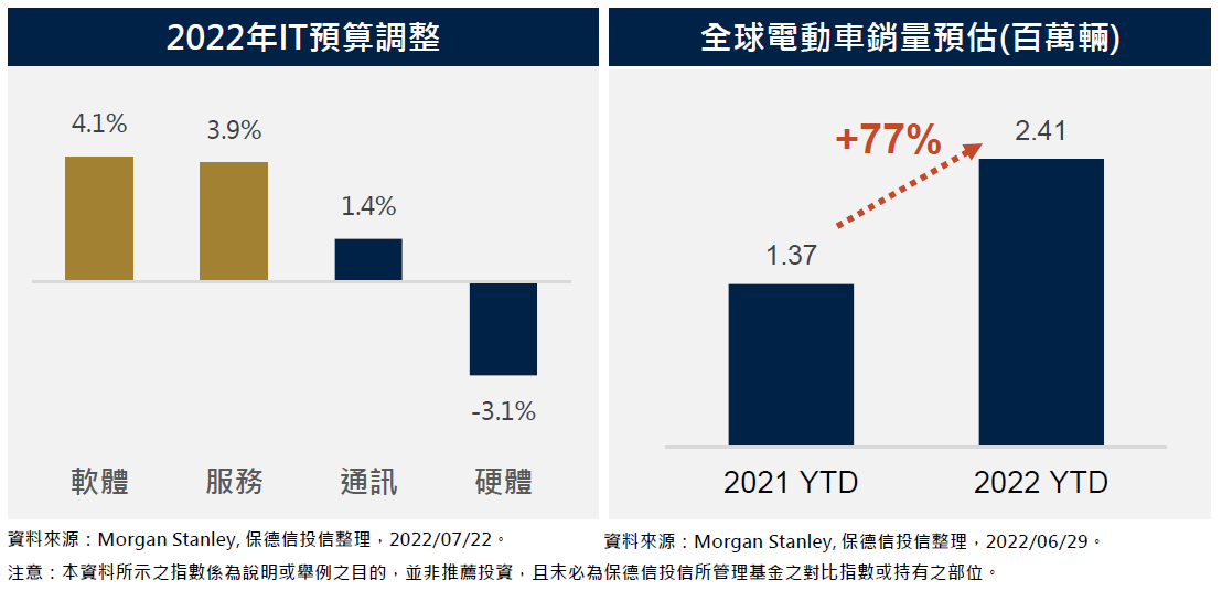 通膨問題與衰退風險、逆勢加速三大新供應鏈成長動能,電動車與雲端服務價值面嚴重低估,因此最具潛力;綠電為民生必需品,提供投資組合下檔韌性。