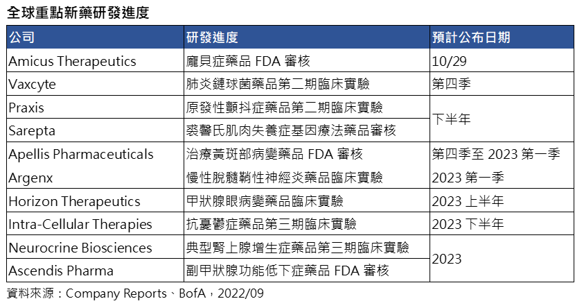 根據統計,未來半年全球主要藥廠中有至少十幾款重要新藥即將公布臨床實驗、FDA審核的新進度等,至2030年市場上更有不少營收可望破百億美元的超級重磅潛力新藥即將問世,包括禮來藥廠的減重藥品,以及美國製藥公司Biogen和禮來藥廠正在研發的兩款阿茲海默症治療新藥,具使用人數多、治療期間長、價格可負擔等獲利優勢,將為醫療產業帶來重要成長動力。(資料來源:BofA Global Research、Visible Alpha,2022/09)