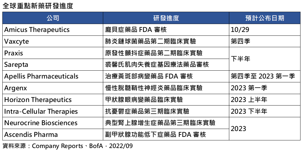 市場將有望帶進超過百億美元營收的超級重磅藥品,視為醫療產業重要成長動力,而這些超級重磅新藥至少符合其中一項特性,例如使用人數多、治療期間長、價格可負擔等,像是新冠肺炎期間的抗疫大功臣新冠疫苗,即符合重磅新藥條件,明顯替相關藥廠挹注龐大營收。(資料來源:BofA Global Research、Visible Alpha,2022/09)