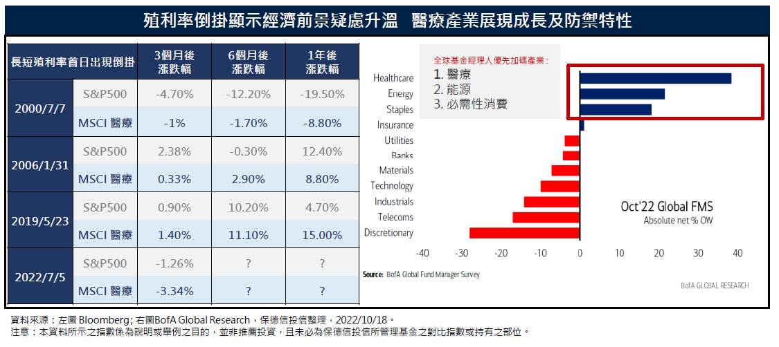 再者,券商美銀美林最新經理人研究報告顯示,高達72%的投資人預期未來12個月經濟將明顯轉弱,反映市場對經濟前景的高度恐慌情緒,而醫療產業為目前多數經理人首要增持配置,突顯具防禦特色的醫療產業在面對市場震盪期間,往往能展現出產業兼具成長與防禦特性的高投資價值。