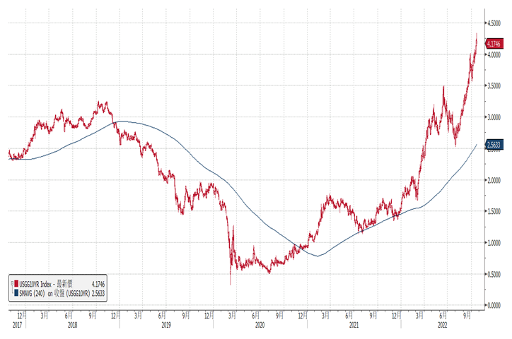 美國通膨回落速度不若預期,9月核心CPI年增6.6%更為連續兩個月成長,帶動市場對通膨預期反轉向上並上調對本次升息終點的預期,帶動10年期美債利率大多時間在4%之上。