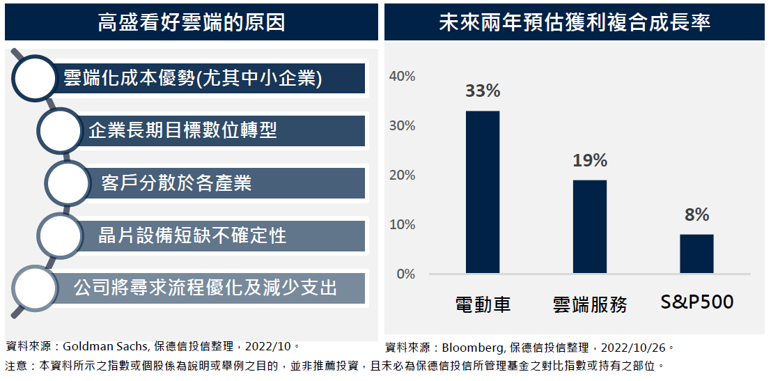 過去企業IT投資雲端化後僅需每月付費訂閱,不合適即可取消,並且更適合目前電價與人力成本高昂的環境中。本投組所布局的新供應鏈體系因產業長期創新與政策支持,因此具明顯的相對高成長優勢,平均獲利複合成長率估將達20%以上,遠高於大盤的8%,相信更能吸引資金的回流進駐。