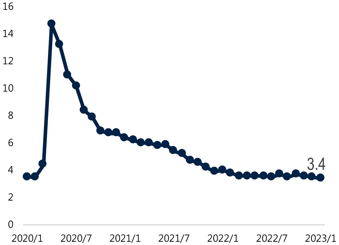 美國1月非農就業新增人數51.7萬,失業率3.4%,也創下53年來新低,顯示就業狀況強勁。不過,由於企業利潤受到擠壓,科技巨頭接連宣布大規模裁員,以削減成本的提升。