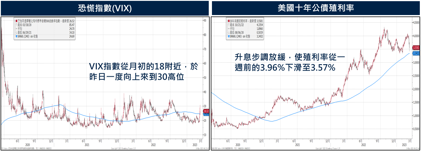 SVB矽谷銀行倒閉後,為了避免引發更大規模金融危機,美國政府提供一系列的穩定銀行措施。今晨美股主要指數開低後,跌幅紛紛收斂,S&P500指數小跌0.15%,收至3855.76點,延續第三個交易日跌勢,Nasdaq指數則逆勢收紅0.45%,收至11188.84點。不過,受到此事件多日的影響,恐慌VIX指數則從月初的18附近,於昨日一度來到30高位;美國十年公債殖利率下滑至3.57%。