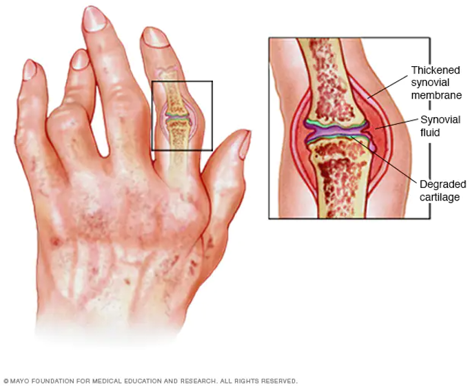 類風濕性關節炎可引起疼痛、腫脹和畸形。隨著關節內襯的組織(滑膜)發炎和增厚,液體積聚,關節侵蝕和退化。