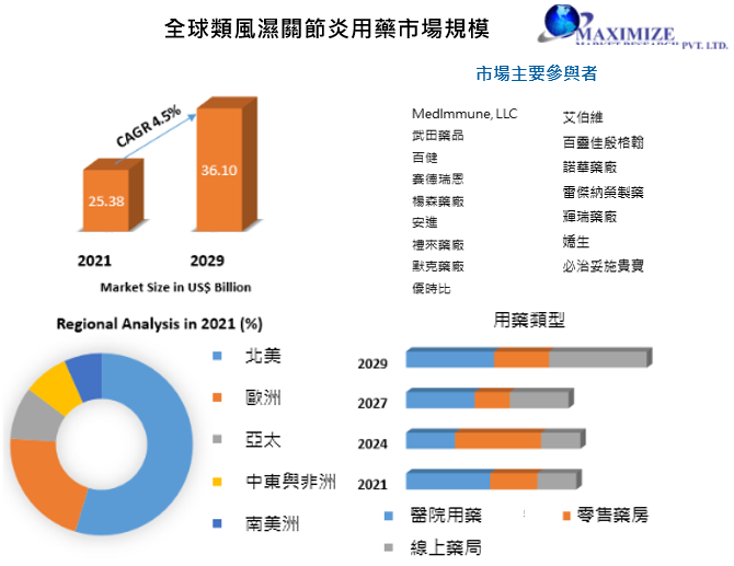 隨著醫療資源不斷提升、用藥需求者在生活品質與醫療資源富足的追求、以及市面尚未研發出可完全治癒類風濕性關節炎的醫療用藥,市場研究機構初估全球類風濕性關節炎的藥物市場規模,將以4.5%複合成長率從2021年253億美元高速擴大至2029年361億美元。其中包括艾伯維生技製藥公司、輝瑞藥廠、嬌生、禮來、必治妥施貴寶、默克藥廠及諾華藥廠等龍頭企業,皆為參與類風濕性關節炎用藥市場的主要參與者,顯示其藥品領域的高競爭性。因此預期在相關用藥市場商機不斷擴大的推波助瀾下,相關製藥與生物研發產業將持續推升類風濕性關節炎藥物市場的發展增速。