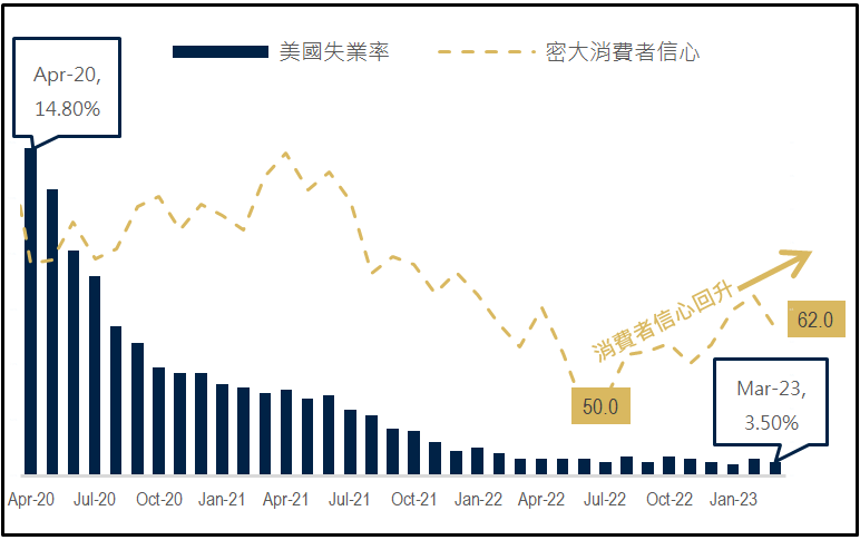 此外,美國3月失業率下滑至3.5%,密西根大學消費者信心指數亦隨去年通膨自峰值回落而明顯回升,凸顯強勁的就業市場與消費動能持續強化美國整體經濟體質的韌性。