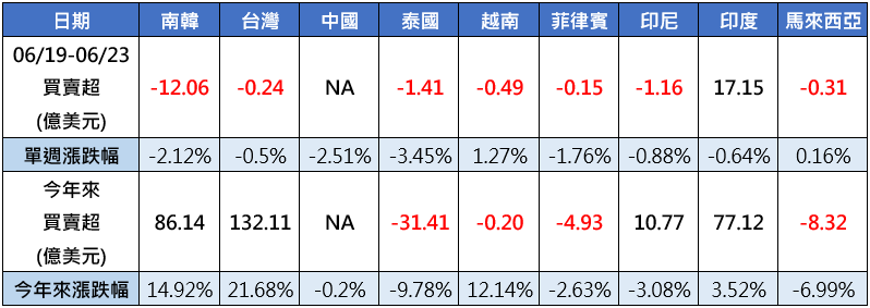 聯準會鷹聲再起,國際資金對於亞股再度轉趨保守,保德信表示,上週除了印度獲得17.15億美元資金大舉挹注之外,其他亞股全數失血,包括台灣與南韓雙雄雙雙中斷連五週的資金回補潮,南韓上週遭資金淨流出12.06億美元,成為亞股失血最甚市場,東協國家則以泰國與印尼表現較落後,分別遭外資提款1.41億美元、1.16億美元資金,至於台股因為僅有三個交易日,外資小幅流出0.24億美元。(資料來源:Bloomberg,2023/06/23)