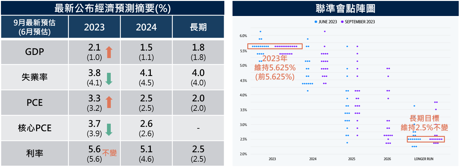 資料來源:(圖左)FOMC,(圖右)FOMC, Yahoo Finance;保德信投信整理,2023/09/21。