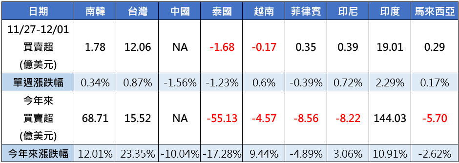 隨著時間進入今年最後一個月,統計年迄今國際資金動向,目前以印度市場獲得超過144億美元買超最高,其次是東北亞雙雄強勁的資金回補,南韓同期獲得加碼68.71億美元,台股則是在外資近月快速回補帶動下,目前資金動向由負翻正,淨流入15.52億美元,反觀國際資金在其他東協市場今年來全數出走,其中泰國股市失血55.136億美元最多,不僅在東協市場敬陪末座,也是亞股中的吊車尾市場。(資料來源:Bloomberg,2023/12/01)