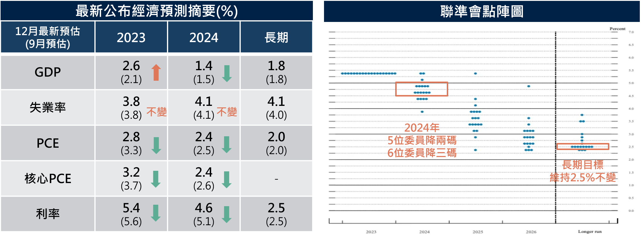 在經濟方面,會議聲明提到經濟活動成長從第三季的強勁步伐放緩,就業成長自今年以來已緩和但依舊強勁,而失業率也維持在低位,過去一年的通膨雖高,但美國的銀行體系依然穩固且具有韌性。另外,下調2024年個人消費支出(PCE)通膨預期至2.4%,美國GDP成長預期下調至1.4%,失業率預期下調至 4.1%。