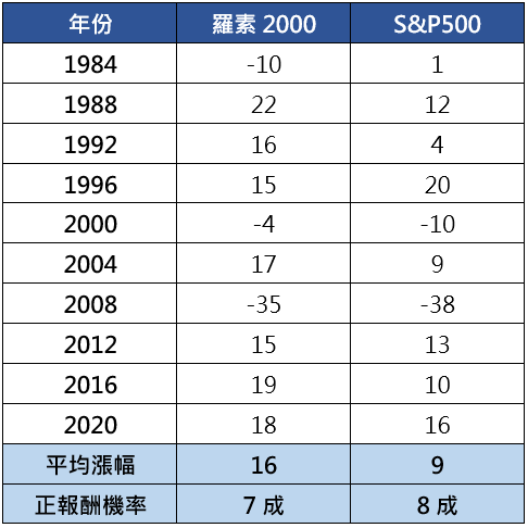 PGIM Jennison美國成長基金產品經理彭子芸表示,美國總統大選結果將左右全球政策、地緣政治、經濟等變化,甚至影響全球未來數年的發展方向,從而改變世界秩序;從歷年資料分析,美國逢總統大選年,不論是大型股或是中小型股都是上漲居多,且上漲機率高達7、8成之多,平均來看,代表大型股的S&P500指數漲幅達9%,而中小型股為主的羅素2000指數平均漲幅更來到16%。(資料來源:policyuncertainty.com、Goldman Sachs、保德信,2024/01)