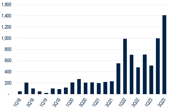 生成式AI浪潮帶動數據中心REITs迎接結構性順風,生成式AI的潛在租賃活動開始進入發酵期,根據統計,自2023年第二季以來,美國數據中心租賃量大幅增加,同時帶動大型數據中心的電力負載量創下單月新高,甚至超過了疫情期間遠距需求帶來的高峰,反映出未來數據中心REITs需求將有增無減。(資料來源:datacenterHawk,保德信整理,2023/07)