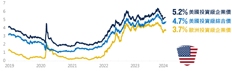 市場仍預期2024年聯準會將開始降息,鎖定高殖利率的需求將持續推動資金流入。2024年美國經濟溫和放緩,美國投等債具備良好財務及信用,收益仍為15年來高點,讓其深具投資價值。