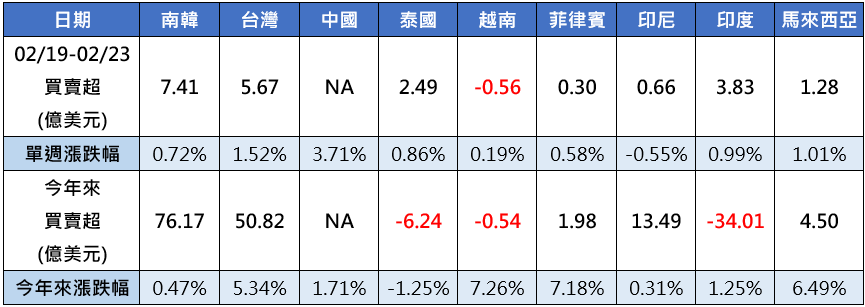 市場情緒持續維持在極度樂觀的位置,吸引外資上週同步挹注亞洲股市,上週國際資金僅小幅賣超越南,其他亞股全數獲得加碼,東北亞雙雄的台韓股市,在AI題材持續火燙帶動下,單週分別獲得5.67億美元、7.41億美元資金買超,第三名為印度的3.83億美元,東協市場以泰國股市單週吸金2.49億美元勝出。(資料來源:Bloomberg,2024/02/23)