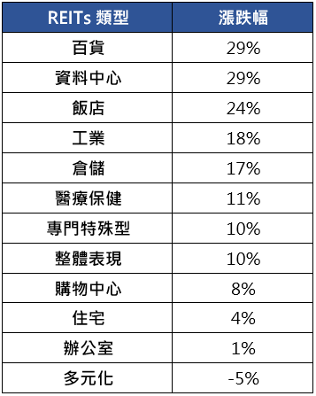全球AI發威,REITs跟著受惠,創新的企業模式與租金揚升,讓疫情之後REITs生態出現改變,而生成式AI的出現,更是引發不同類型REITs間的消長和產業洗牌,根據統計,2023年北美REITs以百貨與資料中心雙雙大漲29%表現並列第一,其次為飯店24%、工業18%、倉儲17%、醫療保健11%,相對地,辦公室REITs表現明顯落後,同期僅1%漲幅。(資料來源:PGIM Real Estate,2023/12/31)