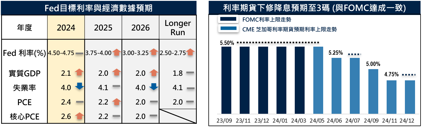 資料來源:左圖: FED 2024/3 經濟預測,有色符號為相較於去年12月的經濟預測調整方向,右圖 : CME Fedwatch, 2024/3/21 。
