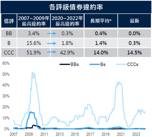 美國非投資級債的「體質」已與過往大相逕庭,目前BB和B級債券合計占美國非投資級債券市場高達9成,CCC級或以下的債券比重持續下滑,整體品質較過去明顯提升,而且從違約率角度來看,過往違約風險多集中於CCC級債券,BB級長期違約僅0.4%、B級僅1.4%,若從最新的數據分析,BB級現階段甚至沒有違約,B級的違約率也只有0.3%,反映出現在的非投資級債已「轉骨」,只要慎選較高評等的債券,便能降低整體信用風險。(資料來源:BofA、PGIM、保德信整理,2024/04)