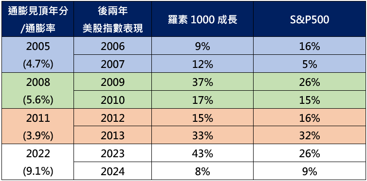 PGIM Jennison美國成長基金產品經理彭子芸表示,回顧30年來共發生過4次通膨大幅上升,包括2005年的4.7%、2008年的5.6%、2011年的3.9%、2022年的9.1%,不過這4次通膨見頂後兩年,美股都繳出平均雙位數的亮眼表現,其中代表成長股的羅素1000成長指數,平均漲幅更達22%,明顯優於S&P500的18%;若將時間拉至最近的2023年分析,羅素1000成長指數2023年單年度漲幅高達43%,大幅勝出同期S&P500的26%,反映出成長股在通膨下滑時,更能吸引資金買單,而科技、通訊服務等更是成長股中的資金寵兒。(資料來源:Bloomberg,保德信,2024/05/06)