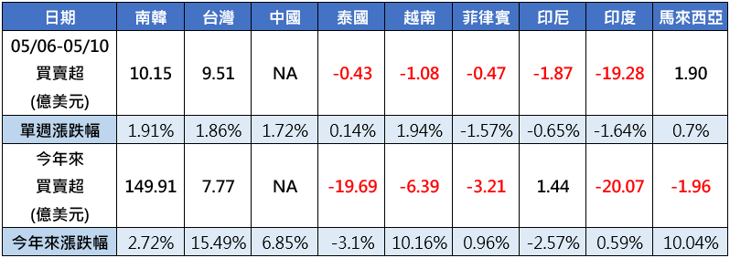 美股回神,與美股高度連動的韓股與台股明顯獲得國際資金青睞,上週外資買超韓股逾10億美元,對台股也有9.51億美元買盤挹注,相較之下,東協與南亞市場幾乎清一色遭賣超,僅有馬來西亞股市資金淨流入近2億美元,其中印度遭提款超過19億美元最高,印尼、越南股市單週資金淨流出逾1億美元。(資料來源:Bloomberg,2024/05/10)