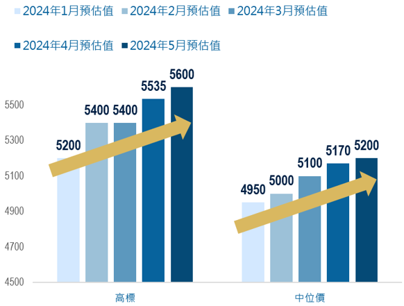 美國最新4月通膨數據降溫,強化聯準會今年2碼的幅度預期,帶動美股近日屢創新高,美國經濟動能強於市場預期,配合通膨放緩,讓各券商看好美股行情潛力,進而上調美股S&P500指數年底目標價,最高上看5600點。(資料來源:Bloomberg,2024/05/16)