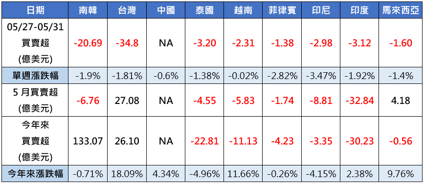 隨著美股漲高,多頭暫歇,外資對亞股買盤也熄火,上週外資對亞股全數站在賣方,台灣、南韓這兩個東北亞雙雄市場遭提款金額最高,分別調節34.8億美元、20.7億美元,而其他東協國家與南亞也全數遭到調節,金額在1億美元至3億美元不等,在受到外資賣超壓抑影響下,上週亞股清一色走跌,越南跌幅-0.02%最輕,印尼下挫-3.47%吊車尾。(資料來源:Bloomberg,2024/05/31)