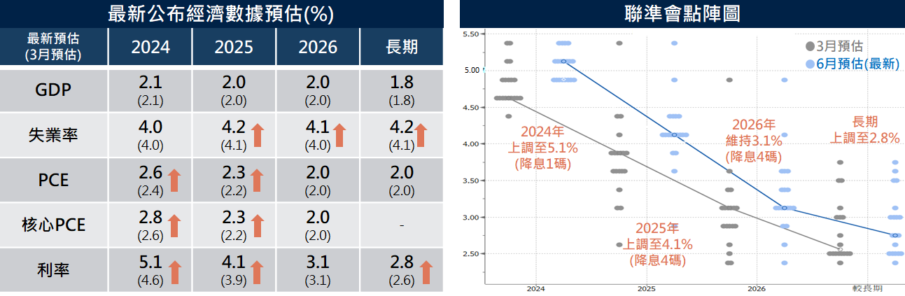 在通膨預估方面,委員們採取保守的立場,通膨取得了「溫和」的進展,惟盼有更多證據顯示通膨正在回落至2%目標,對於今明兩年的PCE與核心PCE也同步上調。而聯準會公布會議結果的稍早,勞工部公布5月CPI較4月放緩,年增率從3.4%降至3.3%,顯然此項數據尚未完全反映到委員對後續政策走向的看法。