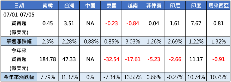 美國經濟數據讓市場對於9月降息預期持續提高,國際資金對亞股買多於賣,上週除了越南、泰國失血之外,其他亞股全球獲得資金淨流入,其中以印度的7.67億美元最高,其次為台股的3.51億美元,另外印尼也吸金1.61億美元名列第三。(資料來源:Bloomberg,2024/07/05)