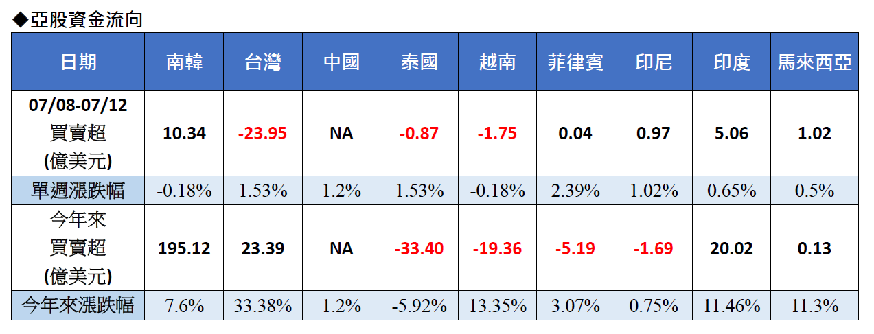 受惠於資金買盤,上週亞股普遍收漲,惟表現與外資買賣超不同調,表現最佳的是菲律賓股市的2.39%,其次為遭賣超金額最大的台股,單週上漲1.53%,泰國股市雖然遭外資小幅調節,上週同樣漲1.53%,陸股與印尼亦上漲逾1%;相對地,單週獲得外資青睞的南韓股市,上週股市不漲反跌-0.18%,越南也同樣下跌-0.18%,成為兩個亞股唯二週線收跌的市場。(資料來源:Bloomberg,2024/07/12)