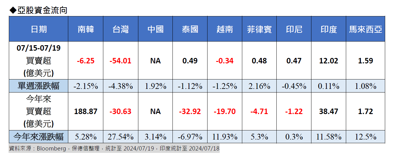 受到美國總統候選人川普對半導體產業的言論影響,東北亞雙雄遭外資大舉提款,保德信指出,上週台股遭到外資大舉賣超超過54億美元,導致今年來資金動能由紅翻黑,國際資金淨流出逾30億美元,成為亞股重災區,南韓單週也失血逾6億美元。(資料來源:Bloomberg,2024/07/19)
