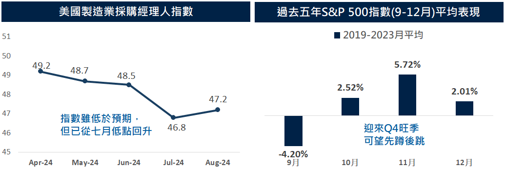 美股重挫的原因,主要在於昨公布美國8月ISM製造業指數為47.2,已連續第五個月萎縮,同時工廠訂單和生產放緩速度加快,製造業整體依然低迷。不過,雖然8月製造業指數仍在景氣榮枯線之下,但從7月的46.8升至47.2,已呈現回升態勢(左下圖)。