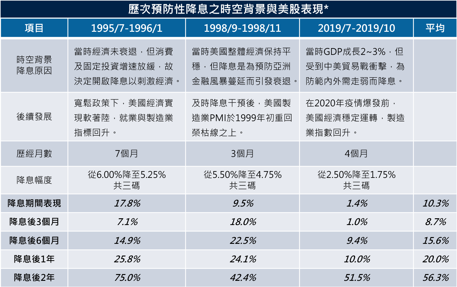 若從過去三次的預防性降息來看,美股在降息期間皆上漲,顯見對提振市場信心有一定的助益。開啟降息後的6個月、1年、甚至2年,股市的表現也都相當不錯。「經濟成長+資金成本降低」,的確是Fed透過預防性降息最想達到的成果!