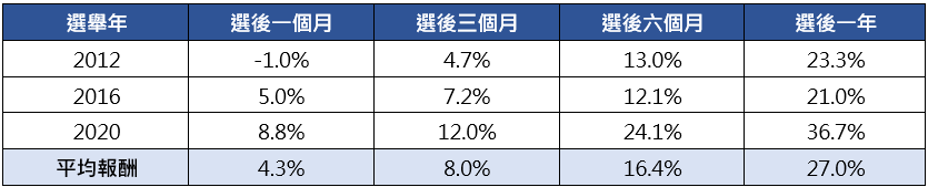 隨著美國大選進入白熱化階段,美股持續高檔震盪,選前受到政治不確定性影響,市場震盪難免,不過當選舉結果塵埃落定之後,股市終將回歸反映基本面,多數時候甚至能展現選後慶祝行情,統計美國總統大選選後美股表現,不僅各期間平均報酬率皆為正值,選後一年漲幅甚至超過兩成。(資料來源:Bloomberg,2024/09)