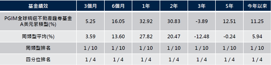 資料來源:Lipper,保德信整理,2024/10/31。同類型基金為Lipper Global分類中「環球房地產股票型」基金。注意:過去之績效不代表未來績效之保證。