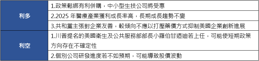 近期醫療產業類股出現較大波動,主要由於市場對川普醫療政策的不確定性產生疑慮,以及短期公債利率上升,特別是川普提名小羅伯甘迺迪為衛生部長引發爭議,進一步加劇市場不安。由於醫療生化產業整體成長性並未改變,在基本面維持不變的情況下,建議採取分批布局方式,不僅能分散風險,同時亦能掌握未來股價上漲機會。(資料來源:Bloomberg、保德信,2024/11/20)