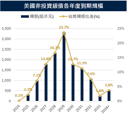 第四季以來美債殖利率波動,美國非投資級債今年來仍吸引約264億美元的資金流入,也替美國非投資級債技術面帶來強勁支撐,此狀況反映了降息趨勢之下,市場對較高息收有一定的需求,加上明年債券到期壓力低,對於企業債務比有利,也不易造成到期違約風險,對於債市有正向幫助。(資料來源:BofA、PGIM,2024/10/31)