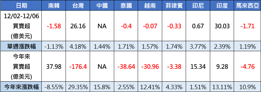進入12月第一週,美國經濟數據持續報喜,亞洲股市也展開反彈走勢,上週外資對亞股買多賣少,買超市場集中在印度與台灣,分別回補逾30億美元、26億美元,受政治影響的南韓與東協市場雖然遭賣超,然金額較之前賣超幅度收斂,南韓遭小幅賣超1.58億美元。(資料來源:Bloomberg,2024/12/06)