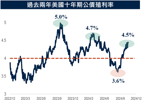 雖然美國債務未來有可能持續上揚,不過,自2000年以來無論是何黨何人執政,美國政府債務都是向上增加,反映出美國透過舉債的財政政策刺激外,也顯示美元在國際市場上的地位。目前市場利率已很大程度反映這些潛在影響,而且政策利率如何降至中性水準,才是後續影響美債殖利率的關鍵,看好現在正處於降息循環,美債殖利率反彈至近期高位後可望再次下滑。(資料來源:Bloomberg,2024/12/19)