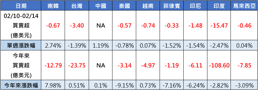 聯準會不急於降息,讓國際資金聚焦成熟市場,亞股再度遭提款,上週外資全數撤出亞股,其中印度股市成為提款重心,單週資金失血超過15億美元,其次是台股遭提款3.4億美元。不過,仍有部分亞股力求週線正報酬,如南韓單週大漲2.74 %第一,陸股單週上漲1.19%表現也不俗,越南、馬來西亞力守正報酬,但相較之下,外資賣超最高的印度股市下挫-2.47%表現吊車尾,印尼、菲律賓、台股等市場跌幅也皆超過-1%。(資料來源:Bloomberg,2025/02/14)