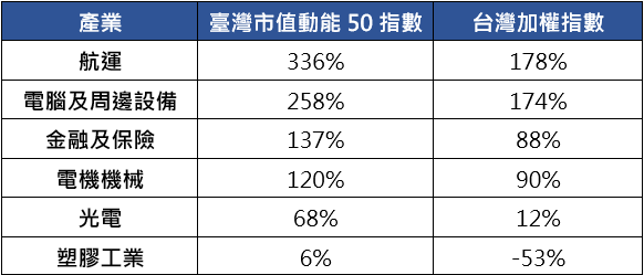 以航運股為例,同期間加權指數類股漲幅為178%,而納入市值動能條件的臺灣市值動能50指數類股漲幅達336%;至於塑膠類股受到台塑四寶拖累,指數不漲反跌-53%,然而加入動能成長因子之後同期間漲幅由黑翻紅為6%,反映出臺灣市值動能50指數眾多產業漲幅超越大盤表現,凸顯追蹤指數選股能力。(資料來源:同下方表格資料來源說明)