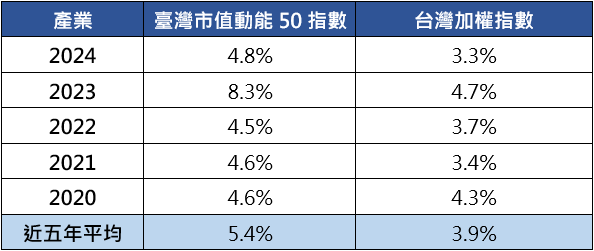 資料來源 : 臺灣指數公司,保德信整理,2020/01/01~2024/12/31。注意:以上指數股利率,係以指數成分股股利率加權平均計算而得,若是ETF之股利率,仍須考量受益人數影響。以上僅為ETF追蹤指數績效或殖利率之表現,不代表本ETF基金之實際報酬率或配息率及未來績效保證,不同時間進場投資,其結果將可能不同,且並未考量交易成本。