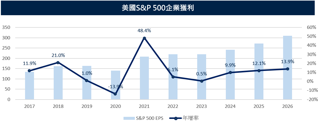 因此我們認為,支撐股價長期上漲動能仍在於基本面,根據FactSet預估今年S&P 500企業獲利仍有機會達12.1%的成長,均可為美股帶來中長期的支撐,其中資訊科技類股仍是主要貢獻來源,隨著企業獲利持續成長,預估也將帶動股市上漲動能。