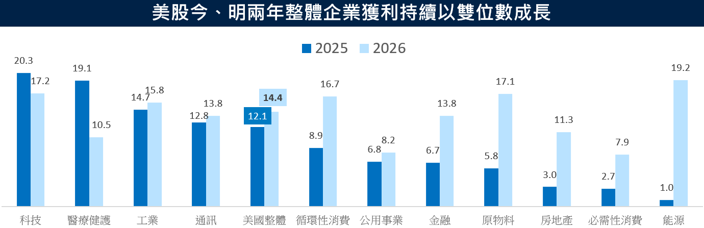 此外,股價最終回歸企業獲利力,券商預估今、明兩年美國整體企業獲利年增幅仍以雙位數12.1%、14.4%成長,其中趨勢型產業將持續為經濟動能注入能量,預期在企業獲利力持續強勁的帶動下,今年美股表現將續強。